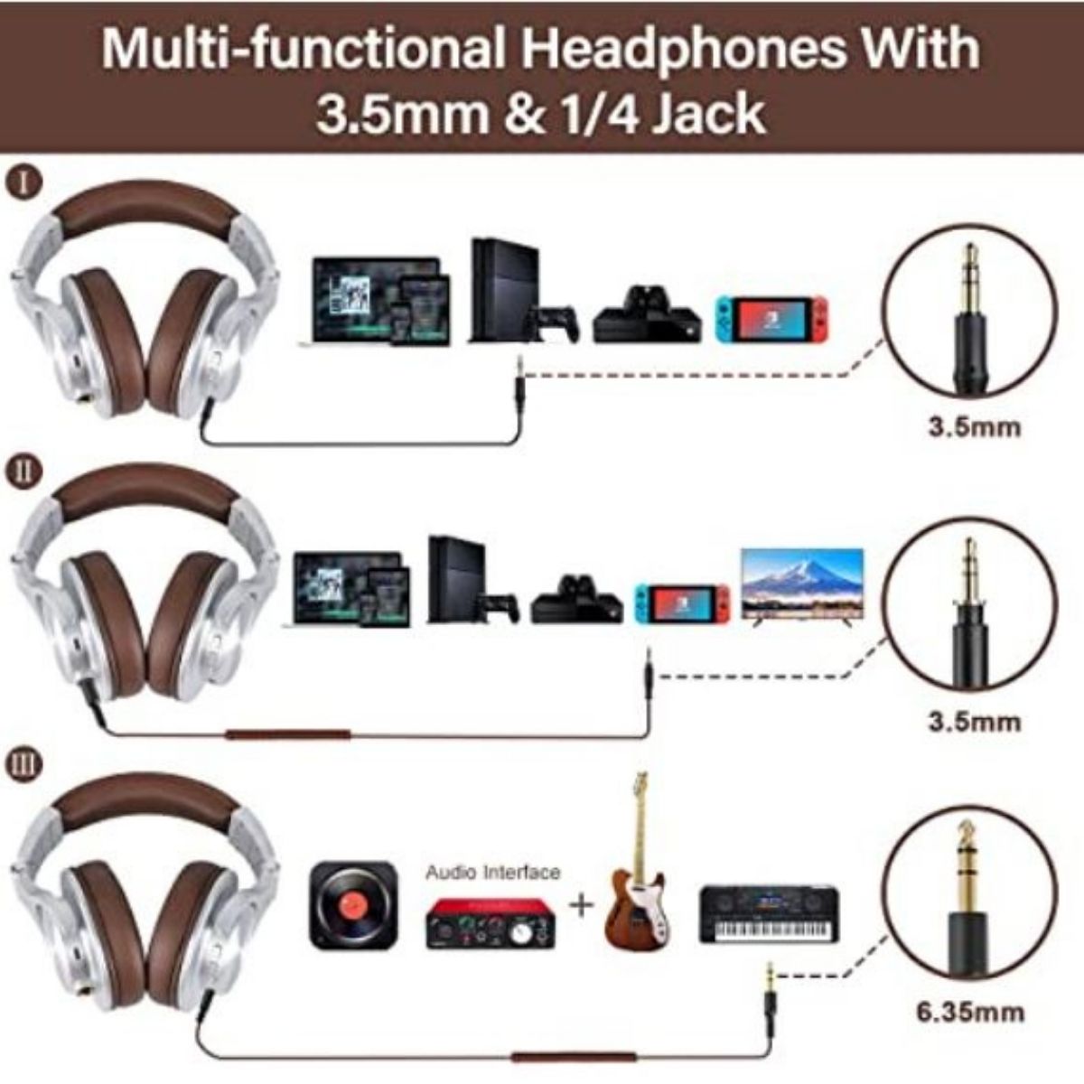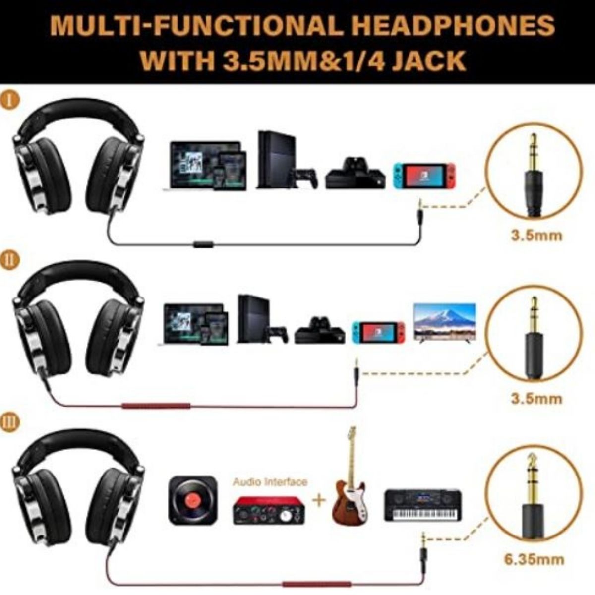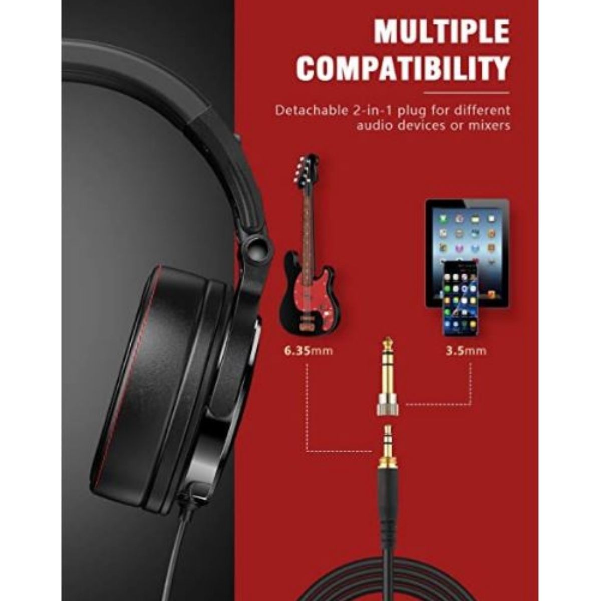 Simply connect according to the plug that matches your cable, and you’ll no longer have to struggle to find an adapter. This headset is perfect for electric guitars, mixers, and keyboards.