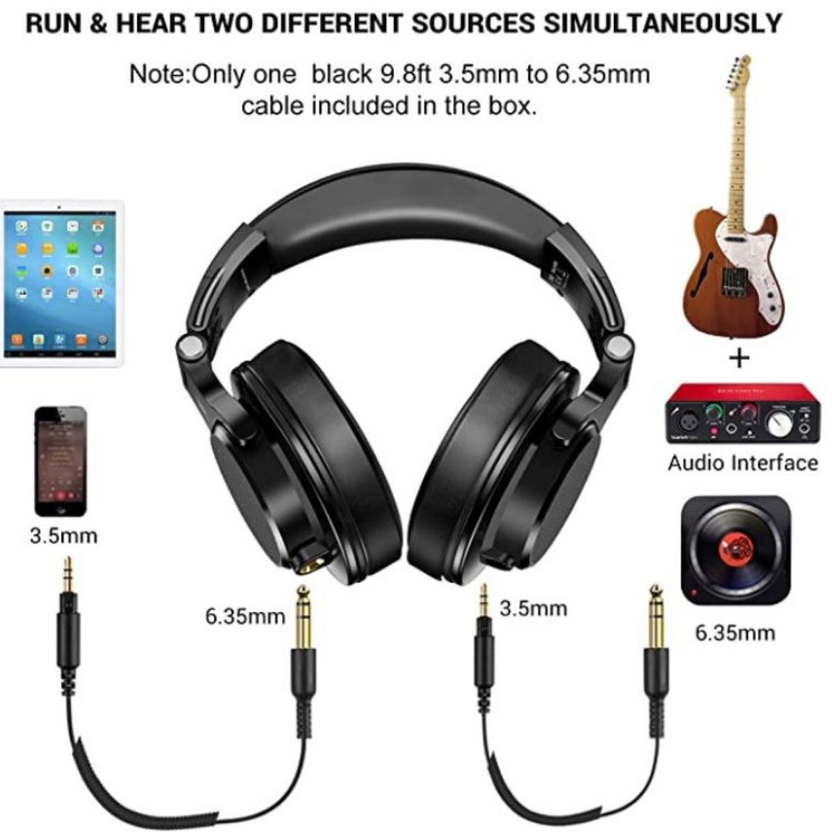 One earcup has a 6.35mm port and the other has a 3.5mm port. You may connect the 6.35mm cable to a DJ deck or an instrument to listen to music.