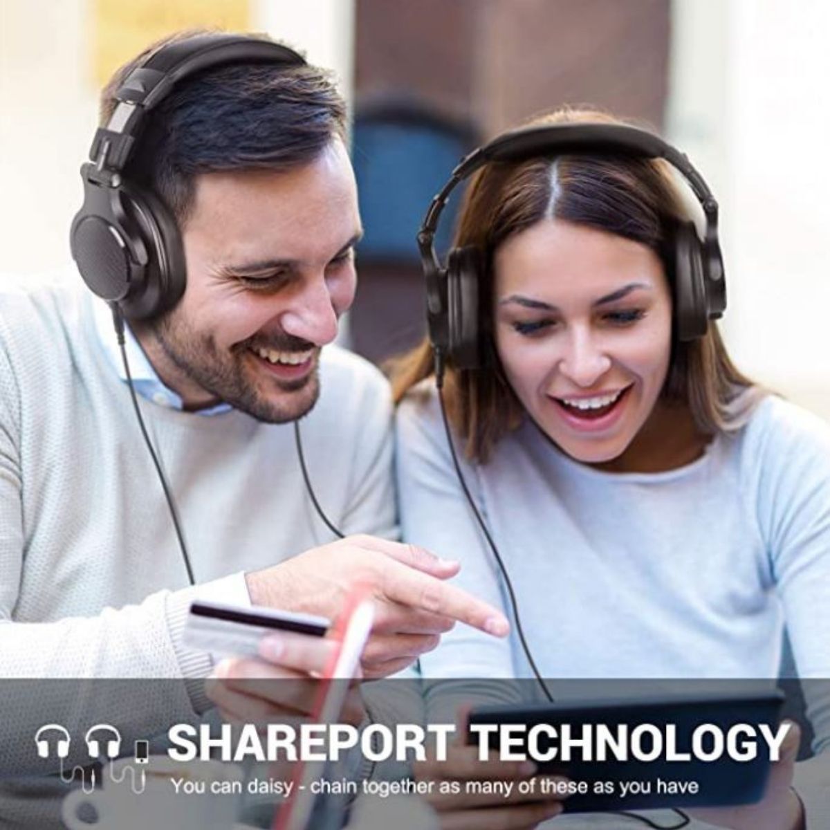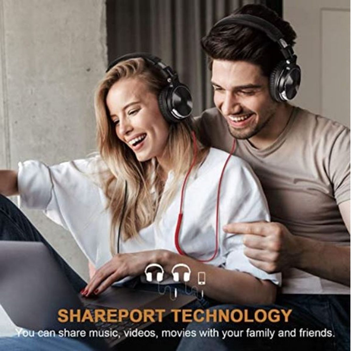 Pair the device using Bluetooth in order to share your music with the dual-purpose cable! Simply put the headphones on pairing mode.